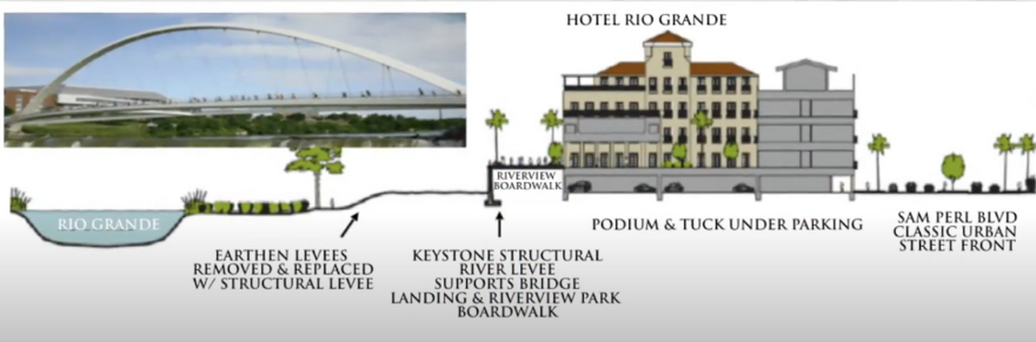 Los dibujos mostraban restaurantes, tiendas, apartamentos y hoteles frente al río, en la orilla del Río Grande.