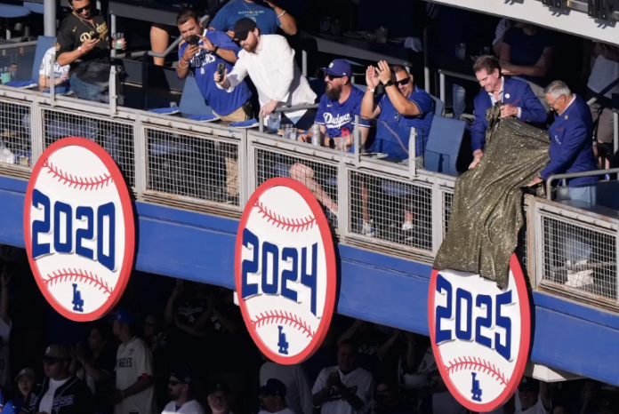 A continuación, Garvey y Jarrín, ahora situados en la sección de palcos por la esquina del jardín derecho, develaron el noveno pendón de campeones de los Dodgers. La figura en forma de pelota de béisbol con el número 2025 se unió a las de 1955, 1959, 1963, 1965, 1981, 1988, 2020 y 2024.