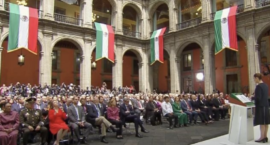 En la primera línea se encontraban, además de la familia de la mandataria, la secretaria de Gobernación; el gabinete de seguridad; el ministro Hugo Aguilar; la nueva presidenta del Senado, Laura Itzel Castillo; la presidenta de Banxico, Victoria Rodríguez Ceja; el fiscal Alejandro Gertz Manero y gobernadores.