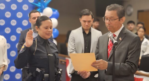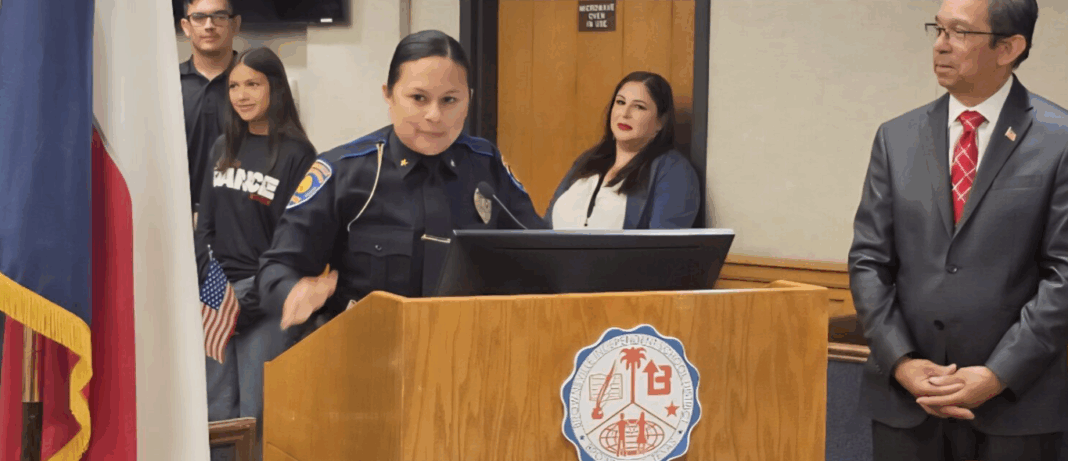 El superintendente del BISD, Dr. Jesús Chavez, tomo el juramento de Anna Gaucin como la primar mujer que se convierte en la nueva jefa del Departamento de Policía del BISD, y dijo en su discurso estar orgulloso de tener una representante con un liderazgo inteligente.