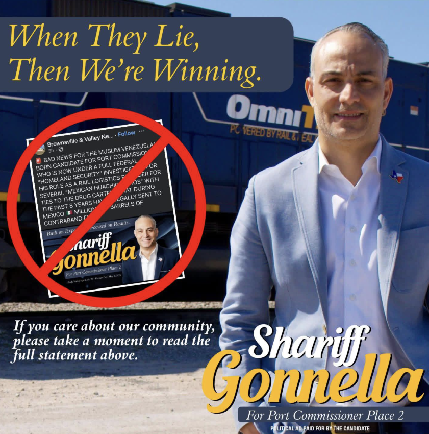 También se ha tratado de perjudicar la imagen del comisionado del Precinto 2 del condado de Cameron, Joey López y más recientemente la de el candidato para el puesto No. 2 de la mesa directiva de el Puerto de Brownsville, Shariff Gonnella.