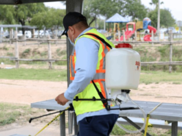 Desinfectan las áreas públicas municipales
