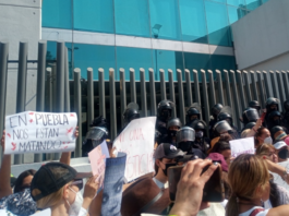 Colectivas se manifiestan en la Fiscalía de Puebla para exigir justicia por el asesinato de la activista Cecilia Monzón.