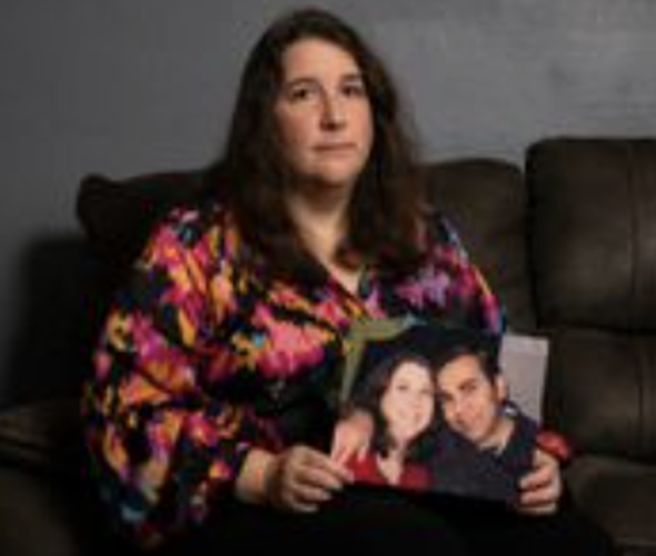 Brandi Rahimi holds a photo of her husband, Shahrokh Rahimi in their home in San Antonio on Dec. 1, 2025.