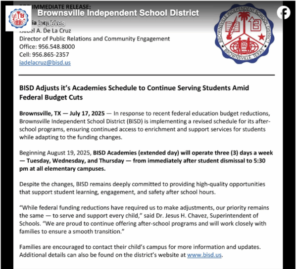 El Distrito Escolar Independiente de Brownsville está revisando el calendario de jornada extendida para todos los campus de las escuelas primarias en medio de recortes presupuestarios federales, según un comunicado de prensa.