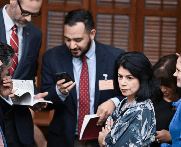 La senadora Carol Alvarado, demócrata de Houston, con su personal en el pleno del Senado, momento antes de la votación final sobre la HB 4 el 22 de agosto de 2025.