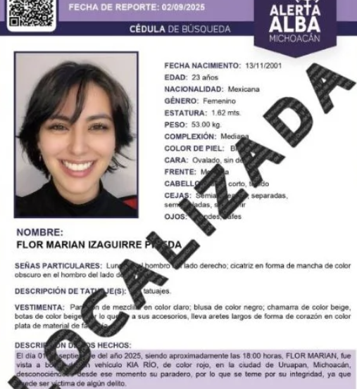 La joven había sido vista por última vez en Uruapan el pasado lunes 1 de septiembre, alrededor de las 6:00 de la tarde, a bordo de un vehículo rojo de la marca KIA y su última publicación se registró el domingo 31 de agosto.