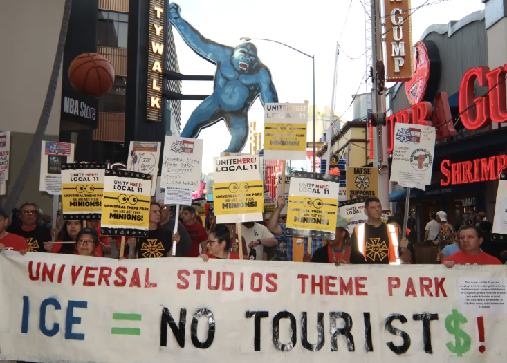Trabajadores de Universal Studios afiliados a los sindicatos UNITE HERE local 11 y IATSE local 193 , miembros de la comunidad y aliados se manifestaron con pancartas gigantes, y distribuyeron volantes “conozca sus derechos”.