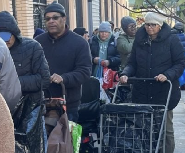 En el distrito del Bronx en Nueva York, alrededor de 200 personas más de lo habitual acudieron al banco de alimentos World of Life Christian Fellowship International, muchas abrigadas con gorros y abrigos de invierno y empujando carritos de compras plegables mientras esperaban en una fila que abarcaba varias cuadras de la ciudad.