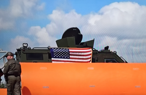 De pie frente a una de las boyas (grandes dispositivos cilíndricos flotantes que pueden medir hasta 15 pies de largo y de cuatro a cinco pies de diámetro), Noem dijo que 130 millas de la barrera de agua ya estaban bajo contrato y estaban comenzando a instalarse ese día.