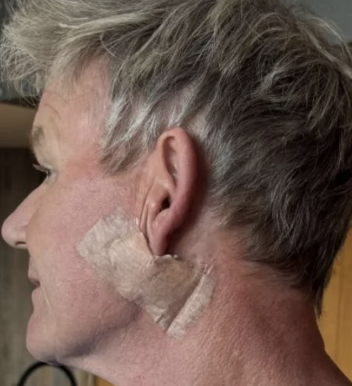 La publicación iba acompañada de dos fotografías, que mostraban a Ramsay de perfil, con un esparadrapo bajo su oreja, donde se encontraba el carcinoma, y con la cicatriz de los puntos de sutura.
