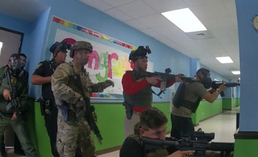 Varios videos muestran a agentes de varios departamentos dentro del pasillo de la escuela y de pie afuera; algunos sugieren arrojar gasolina por la ventana o buscar la llave del aula cerrada. Pero no está claro quién está al mando.
