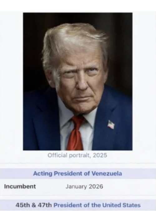 El presidente estadounidense, Donald Trump, publicó este domingo en Truth Social una imagen manipulada de su perfil en Wikipedia, en la que se atribuye el cargo de “presidente interino de Venezuela” a fecha de enero de 2026.